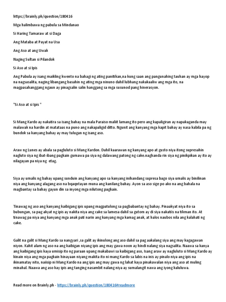 Pabula sa mindanao brainly. Mga pabula sa mindanao. Pang-ugnay na Ginagamit sa Pagbibigay Sanhi at Bunga Nakikilala ang katangian ng mga tauhan batay sa tono at paraan ng kanilang pananalita. Ang pabula o fable ay isang uri ng panitikan kung saan ang mga tauhan ng kuwento ay mga hayop o mga bagay na walang buhay.