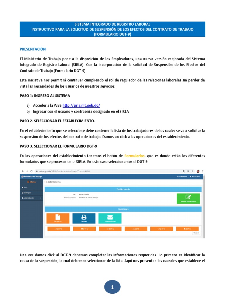 Para reportar la suspensión de los contratos de trabajo primeramente debemos ingresar al Sistema Integral de Registros Laborales SIRLA de la plataforma virtual del Ministerio de Trabajo SIRLAMTGOBDO. El Sistema Nacional ALACFT está conformado por varios componentes que se coordinan entre sí para generar una cadena de valor que redunde en información efectiva para los entes judiciales. El ministro de Trabajo Winston Santos dio a conocer este sábado el instructivo de cómo el empleador debe ingresar al Sistema Integrado de Registro Laboral SIRLA con el fin de aplicar para el Fondo de Asistencia Solidaria al Empleado FASE que tiene el objetivo de apoyar de manera transitoria a los trabajadores que se han visto afectados con las medidas tomadas.